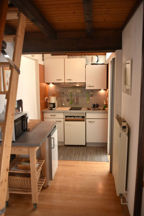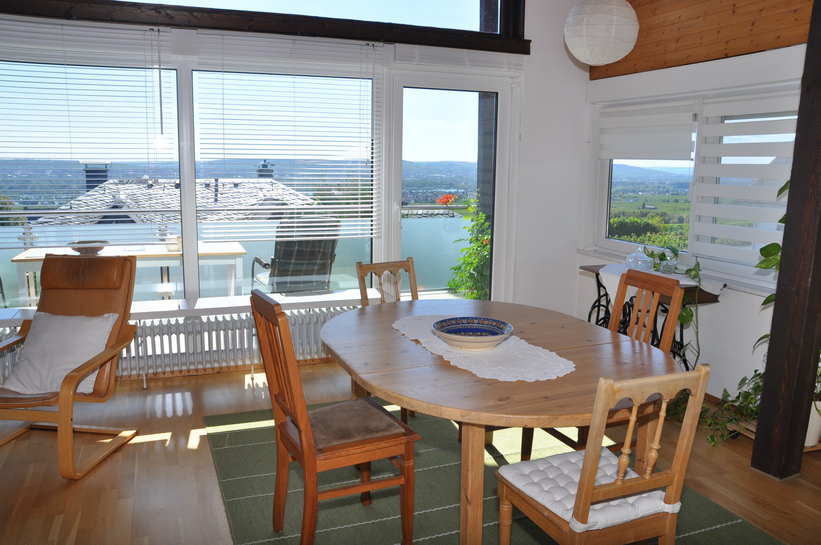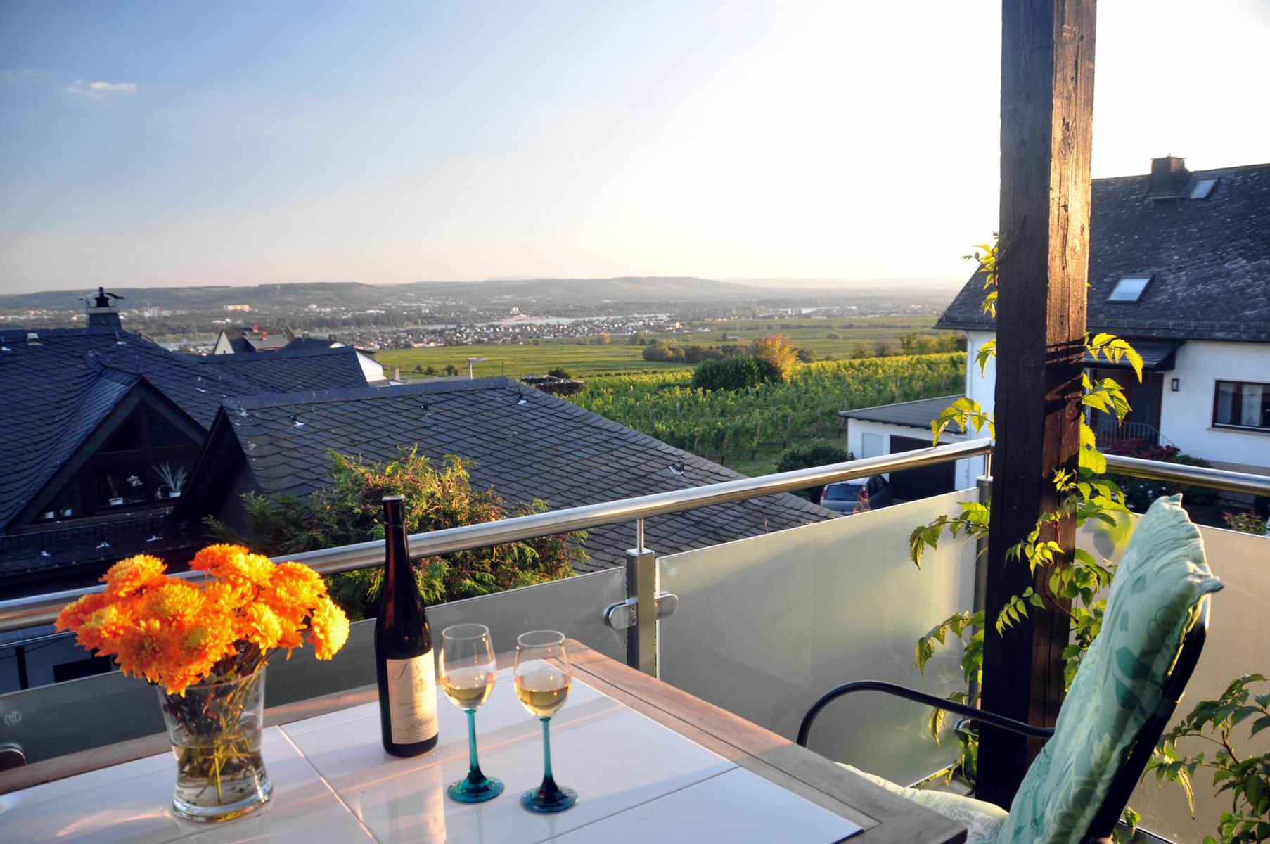 Unsere Ferienwohnung mit 55 qm in ruhiger Lage an den Weinbergen besteht aus einem Wohn-Schlafraum (Studio) im ersten Stock mit großem Panoramafenster und Südbalkon mit herrlichem Blick auf den Rhein.