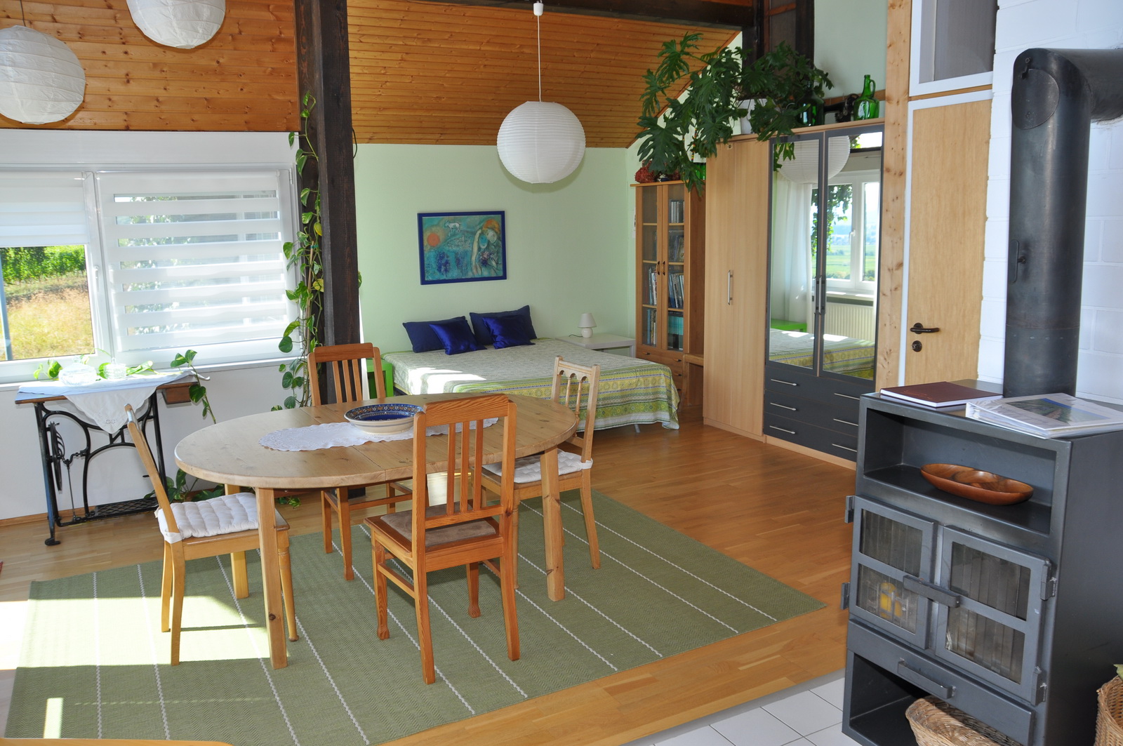 Mit dem angrenzenden Wohnraum bietet die Ferienwohnung Schlafplätze für bis zu 4 Erwachsene oder 2 Erwachsene und 1-2 Kinder. Zusätzlich bieten wir Ihnen eine kleine Küche, ein Tageslichtbad mit Duschbadewanne, Kabel-TV/Radio und kostenlosen WLAN-Zugang.